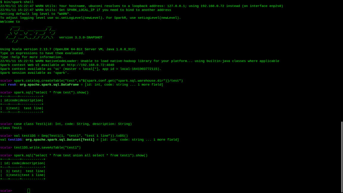 spark.catalog.createTable("test",s"${spark.conf.get("spark.sql.warehouse.dir")}/test")Сохранить же данные в таблицу с отвутствии hive'а можно стандартным методом saveTableAs (если таблица новая) или insertInto (если существующая)